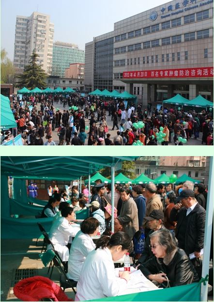4月20日上午,中国医学科学院肿瘤医院门诊楼前百名权威肿瘤专家现场咨询活动如期举行,千余名患者、家属及健康人群前来参加,现场人头攒动,热闹非凡,将“2013年肿瘤防治宣传周”大型公益活动推向高潮。