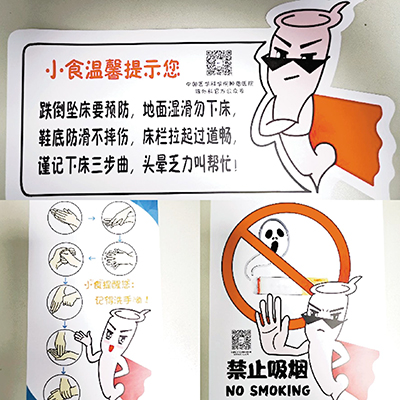 为形象生动地传达知识要点,以患者及家属看得懂、记得住、学得会的方式开展医患沟通,科室人员集思广益,创建了拟人化科普形象代言人,护士李烨发挥绘画专长精心为这个科普人物设计了卡通形象,并注册了版权,大家给它取名“小食”。